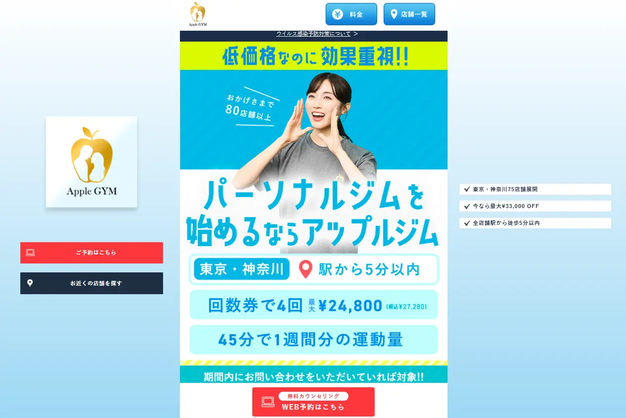 | 体験 | 入会金5円・パーソナルトレーニング体験30分無料 |